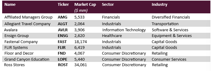 During the quarter, we had 10 companies contributing to our performance, and each of the ten was a positive contributor. Our largest gainers were Avalara (AVLR), Floor & Decor Holdings (FND – which along with AVLR and ENSG was discussed in our 2018 review letter http://bit.ly/2018_Company_Overviews) and Allegiant Travel (ALGT). These three were responsible for about 60% of the quarter’s performance. Although each of these companies released somewhat stronger than anticipated Q4 results and 2019 guidance, nothing remarkable drove their stock performance, and each continues, in our opinion, to have a very long runway of growth. Also positively contributing, in order of largest impact to smallest, were Ensign Group (ENSG), Grand Canyon Education (LOPE), Fastenal (FAST), Ross Stores (ROST), Affiliated Managers Group (AMG), FLIR Systems (FLIR), and Healthcare Services Group (HCSG), which was sold during the quarter and discussed below.