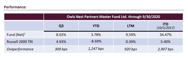 - Performance presented from inception through September 2020 is for a representative account of the Owls Nest Partners Concentrated Long Only SMA strategy (the “Strategy”). As of October 2020, performance is for a composite of separately managed accounts managed in accordance with the Strategy (the “Composite”). Performance is presented gross and net of all fees, as of the date listed at the top of this document. The fees applied are the prevailing fees of the Strategy at the time such performance was generated. From inception to the date of this document, the fee structure applied is a 1% annual management fee, and 15% performance fee that is charged only on the outperformance of the Strategy to the Benchmark (as defined below), and only after five years. Performance fees are accrued monthly. The vehicle for the Strategy is a separately managed account. All performance is calculated by the Adviser. Further information regarding the Strategy or the Composite can be provided upon request. The Adviser does not claim compliance with the GIPS reporting standards and the performance presented herein has not been audited or verified by any third-party. The Russell 2000 Total Return Index (the “Benchmark”) is a broad market index that is presented for comparative purposes as the performance benchmark to the Fund. The Benchmark is an unmanaged index consisting of the smallest 2000 stocks in the Russell 3000 Index. The stocks are issued in the United States, and the Benchmark includes the reinvestment of all dividends and income. Because the Benchmark is unmanaged, it assumes no transaction costs, management and performance fees, or other expenses. Unlike the Fund, it contains only domestic companies and is rebalanced monthly. Therefore, while the Benchmark contains publicly traded companies, it does not purport to represent an exact performance comparison to the Strategy. It is not possible to invest directly in an index, such as the Benchmark.