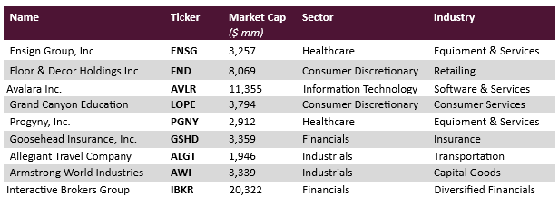We had six stocks that were gainers in the quarter. Gainers, in order of largest impact to smallest, were Ensign Group (ENSG), Floor & Decor (FND), Goosehead Insurance (GSHD), Progyny (PGNY), Interactive Brokers (IBKR), and Allegiant Travel (ALGT). In the quarter we had four detractors which were, in order of largest impact to smallest, Grand Canyon Education (LOPE), Armstrong World Industries (AWI), Avalara (AVLR), and Affiliated Managers Group (AMG) which was exited during the quarter.