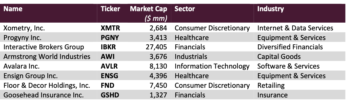 We had seven stock prices advance and two decline. The largest contributor was Xometry followed by Avalara and Progyny. Repay and Goosehead were our decliners.