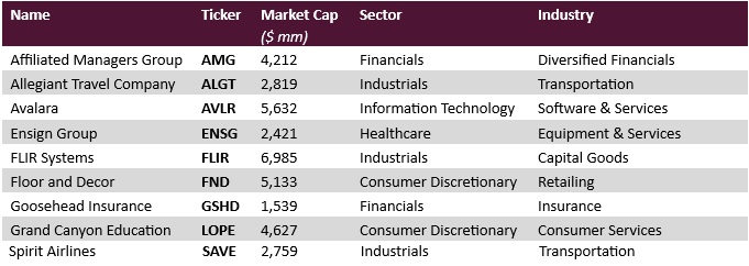 During the quarter, five of the nine companies we owned were positive contributors, while four detracted from performance. In order of largest impact to smallest, our gainers were Ensign Group (ENSG), Allegiant Travel (ALGT), Avalara (AVLR), Affiliated Managers Group (AMG) and Spirit Airlines (SAVE). The decliners, also in order of largest impact to least, were Goosehead Insurance (GSHD), Grand Canyon Education (LOPE), Floor & Decor (FND) and FLIR Systems (FLIR). While it was a volatile quarter for some of the stocks, it was a boring, businessas-usual quarter fundamentally for the portfolio companies as a whole.