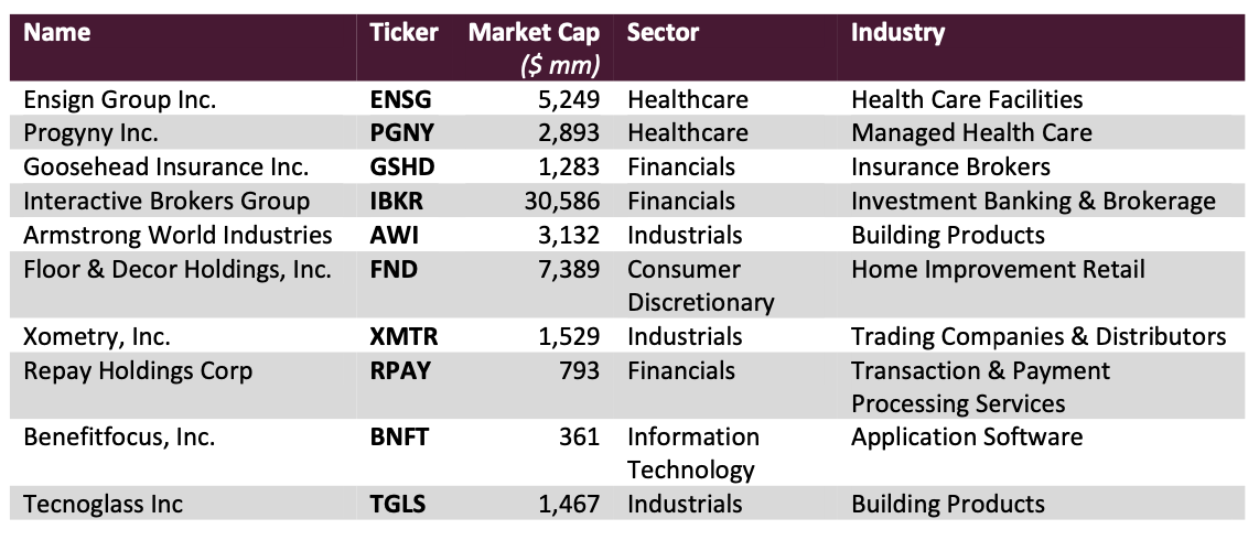 Progyny (PGNY) also detracted from the quarter’s results despite actually raising earnings estimates in the quarter. Progyny is the leading provider of managed fertility benefits to large employers. The market is concerned primarily about the impact of layoffs at large technology companies, many of whom are Progyny clients. The issue is real, but we think it is dramatically overestimated given Progyny’s diverse customer base in which more than 80% come from outside tech, and the fact that they have modest single digit penetration of their core target market while having near 100% client retention, outstanding outcomes, and no direct competition able to offer a similar service. Armstrong World Industries (AWI) also declined somewhat, and Floor & Decor (FND) was a very modest negative performer.