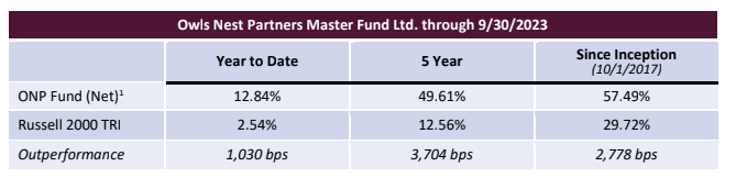 - Performance presented from inception through September 2020 is for a representative account of the Owls Nest Partners Concentrated Long Only SMA strategy (the “Strategy”). As of October 2020, performance is for a composite of separately managed accounts managed in accordance with the Strategy (the “Composite”). Performance is presented gross and net of all fees, as of the date listed at the top of this document. The fees applied are the prevailing fees of the Strategy at the time such performance was generated. From inception to the date of this document, the fee structure applied is a 1% annual management fee, and 15% performance fee that is charged only on the outperformance of the Strategy to the Benchmark (as defined below), and only after five years. Performance fees are accrued monthly. The vehicle for the Strategy is a separately managed account. All performance is calculated by the Adviser. Further information regarding the Strategy or the Composite can be provided upon request. The Adviser does not claim compliance with the GIPS reporting standards and the performance presented herein has not been audited or verified by any third-party. The Russell 2000 Total Return Index (the “Benchmark”) is a broad market index that is presented for comparative purposes as the performance benchmark to the Fund. The Benchmark is an unmanaged index consisting of the smallest 2000 stocks in the Russell 3000 Index. The stocks are issued in the United States, and the Benchmark includes the reinvestment of all dividends and income. Because the Benchmark is unmanaged, it assumes no transaction costs, management and performance fees, or other expenses. Unlike the Fund, it contains only domestic companies and is rebalanced monthly. Therefore, while the Benchmark contains publicly traded companies, it does not purport to represent an exact performance comparison to the Strategy. It is not possible to invest directly in an index, such as the Benchmark.