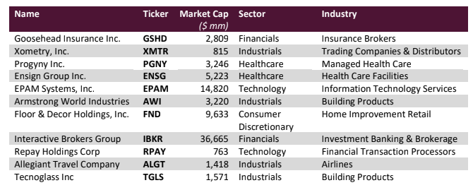 Given the opportunity we described above in Xometry, we have added very significantly to our position there making it our largest addition year to date. Our next biggest addition year to date is our new position EPAM Systems (EPAM) discussed in detail below. Of late, we have also added meaningfully to Progyny (PGNY) which trades at a significant discount to historical averages and precedent healthcare technology transactions despite growing at a vastly faster rate, having greater market leadership, and possessing enormously superior economics and free cash flow generation. Our largest sale has been to reduce the size of our Interactive Brokers position into strength this year. While the company is still growing at a good clip, the stock has performed well enough that we wanted to redeploy some dollars into the more coiled stocks of Progyny and Xometry. We had a small position in Benefitfocus (BNFT) which was acquired at a premium, freeing up some capital as well. Lastly, we also reduced the size of our position in Floor & Decor earlier in the year when the stock price moved up meaningfully perhaps anticipating an improvement in the current environment earlier than when we think likely. Although Floor & Decor has been a big winner for us since we first bought it and is our second largest gainer this year, it is now our smallest position. That said, our long-term enthusiasm remains. The company’s ability to gain share in this period of depressed existing home sales will only accelerate, especially against the smaller independent and regional chains who still control more than half the industry but who must be hating life right now. Floor & Decor benefitted significantly from the global financial crisis when thousands of independent retailers shut their doors. We expect the same thing to happen during the current contraction in existing home sales, and we look forward to the point when we feel we can add back to our position.