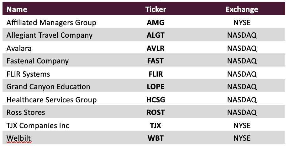 During the quarter, we sold one name due to a pending merger and replaced it with a new name, such that we had 11 companies contributing to our performance. On the positive side, in order of impact, were Fastenal (FAST), FLIR Systems (FLIR), TJX Companies (TJX), Ross Stores (ROST) and Wabtec (WAB). Our decliners, also in order of impact, were Avalara (AVLR), Affiliated Managers Group (AMG), Allegiant Travel (ALGT), Welbilt (WBT), Healthcare Services Group (HCSG), and Grand Canyon Education (LOPE). We exited the quarter with a median market cap of ~$5B.
