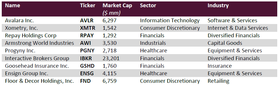Aside from Datto, the share prices of all other holdings were down during the quarter, led by Progyny (PGNY), Goosehead Insurance (GSHD) and Avalara (AVLR). This sounds odd, but we believe Progyny’s stock price decline had practically nothing to do with Progyny whose fundamental momentum and outlook is as strong as ever. Instead, the problem is that it has no direct peers and is lumped in by sell-side analysts with an eclectic menagerie of health care “tech enablers” most of which are recent IPOs, quickly running through cash reserves and no clear track to eventual profitability or even survival, in some cases. Progyny, by contrast, is highly profitable, self-funding its rapid growth and loaded with cash. As we’ve experienced and discussed before, this “baby with the bathwater” phenomenon can only last so long, and the cream in a reasonable time frame rises to the top. Avalara’s price reflects fears around the slowdown in e-commerce, and Goosehead’s primarily reflects concerns related to the slowdown in housing transactions which serve as an important source of leads for new client acquisition for Goosehead.