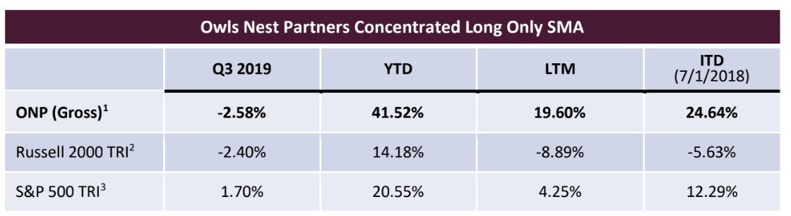- All “portfolio” information presented is for the Owls Nest Partners Concentrated Long Only SMA (the “Strategy”). Such data represents preliminary, unaudited, figures that are subject to change. The Adviser prepares final month-end and quarterly performance figures for the Strategy, which therefore represent its own internal, unaudited estimates of performance. Because the Strategy is only offered via separate account or SMA/UMA platforms, fees will be different for each client of the Strategy. Therefore, all performance returns are presented gross of all fees and expenses. For further information regarding Strategy performance, please contact the Adviser at info@owlsnestpartners.com, or by calling 484-352-1110.