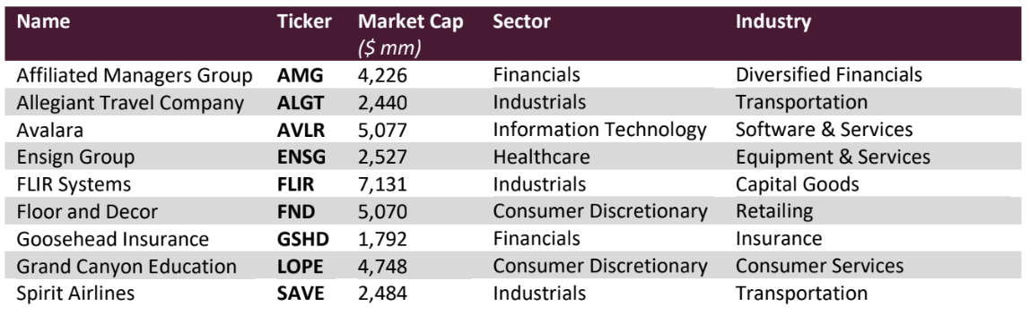 During the quarter, five of the eleven companies we owned at some point during the quarter were positive contributors, while six detracted from performance. In order of largest impact to smallest, our gainers were Floor & Decor (FND), Goosehead Insurance (GSHD), Allegiant Travel (ALGT), Ross Stores (ROST) and Fastenal (FAST). The decliners, also in order of largest impact to least, were Grand Canyon Education (LOPE), Ensign Group (ENSG), Affiliated Managers Group (AMG), Avalara (AVLR), FLIR Systems (FLIR), and new name, Spirit Airlines (SAVE). In simplest terms, Grand Canyon accounted for 88% of the quarter’s retracement, and the rest was close to a wash. We are very enthusiastic about Grand Canyon and added appreciably to the position during the quarter. While it was a volatile quarter for some of the stocks, it was a boring, business-as-usual quarter fundamentally for the portfolio companies as a whole.