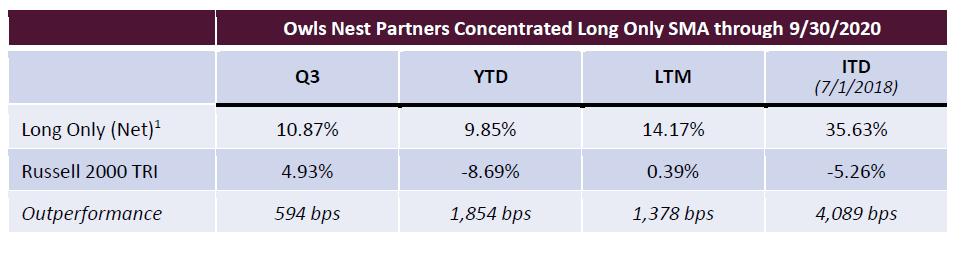 - Performance presented from inception through September 2020 is for a representative account of the Owls Nest Partners Concentrated Long Only SMA strategy (the “Strategy”). As of October 2020, performance is for a composite of separately managed accounts managed in accordance with the Strategy (the “Composite”). Performance is presented gross and net of all fees, as of the date listed at the top of this document. The fees applied are the prevailing fees of the Strategy at the time such performance was generated. From inception to the date of this document, the fee structure applied is a 1% annual management fee, and 15% performance fee that is charged only on the outperformance of the Strategy to the Benchmark (as defined below), and only after five years. Performance fees are accrued monthly. The vehicle for the Strategy is a separately managed account. All performance is calculated by the Adviser. Further information regarding the Strategy or the Composite can be provided upon request. The Adviser does not claim compliance with the GIPS reporting standards and the performance presented herein has not been audited or verified by any third-party. The Russell 2000 Total Return Index (the “Benchmark”) is a broad market index that is presented for comparative purposes as the performance benchmark to the Fund. The Benchmark is an unmanaged index consisting of the smallest 2000 stocks in the Russell 3000 Index. The stocks are issued in the United States, and the Benchmark includes the reinvestment of all dividends and income. Because the Benchmark is unmanaged, it assumes no transaction costs, management and performance fees, or other expenses. Unlike the Fund, it contains only domestic companies and is rebalanced monthly. Therefore, while the Benchmark contains publicly traded companies, it does not purport to represent an exact performance comparison to the Strategy. It is not possible to invest directly in an index, such as the Benchmark.