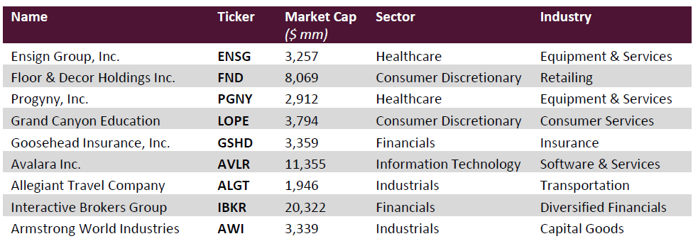 We had six stocks that were gainers in the quarter. Gainers, in order of largest impact to smallest, were Ensign Group (ENSG), Floor & Decor (FND), Goosehead Insurance (GSHD), Progyny (PGNY), Allegiant Travel (ALGT), and Interactive Brokers (IBKR). In the quarter we had four detractors which were, in order of largest impact to smallest, Grand Canyon Education (LOPE), Armstrong World Industries (AWI), Avalara (AVLR), and Affiliated Managers Group (AMG) which was exited during the quarter.