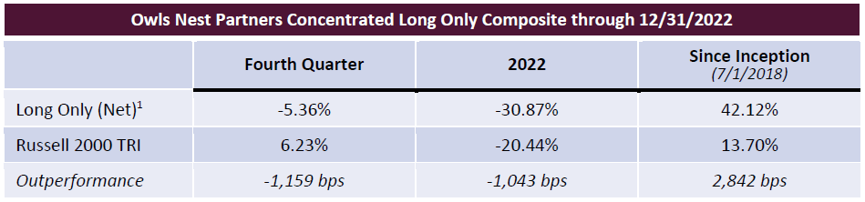 1Past performance is not indicative of future results. Performance presented from inception through September 2020 is for a representative account of the Owls Nest Partners Concentrated Long Only SMA strategy (the “Strategy”). As of October 2020, performance is for a composite of accounts managed in accordance with the Strategy (the “Composite”). Please see the Disclosures at the end of this document for further information with regards to performance.